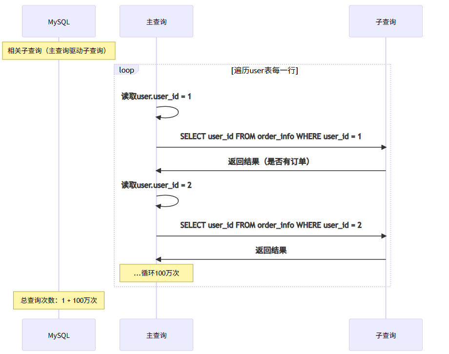 同事B:“这是相关子查询,每个用户都要执行一次,相当于执行了100万次子查询!”