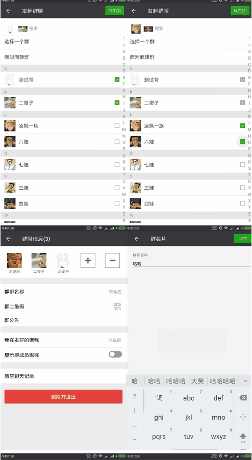 - 群组:创建群、拉人入群、踢人出群、修改群名片、查看群二维码、群公告(可查看、发布)、修改我在群中的昵称、显隐群成员昵称、退出群组