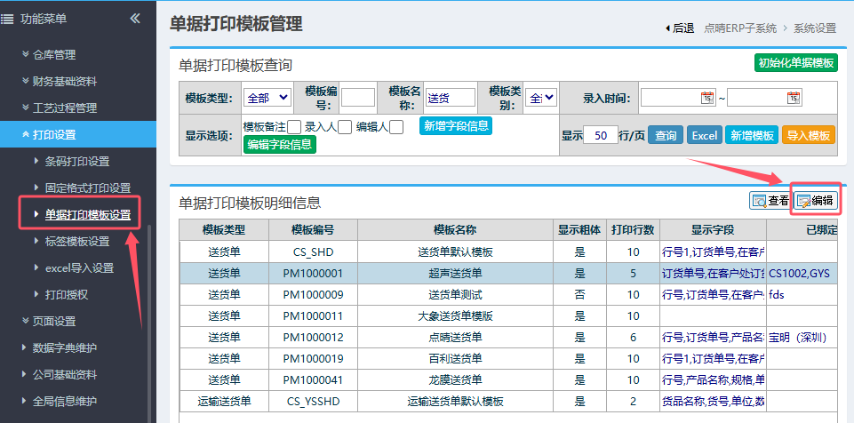 以管理员身份进入点晴ERP-》系统管理-》打印设置-》单据打印模板设置: