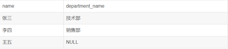 注意:员工“王五”被包含在结果中,但因为他不属于任何部门,所以department_name为NULL。