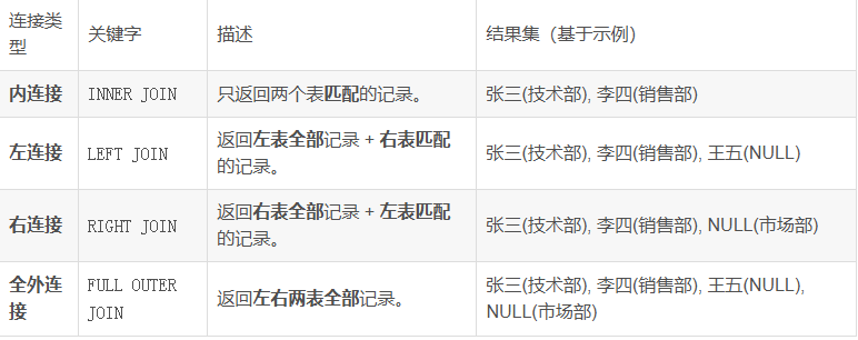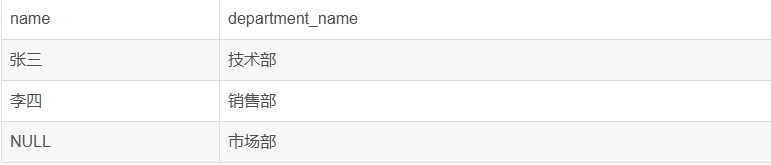 注意:员工“王五”的department_id为NULL,在部门表中找不到匹配项,所以没有出现。部门“市场部”在员工表中没有对应的员工,所以也没有出现。