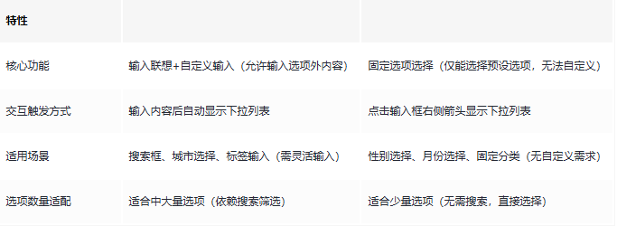 • 需兼顾“选择”与“自定义输入”的场景(如城市选择、邮箱输入);