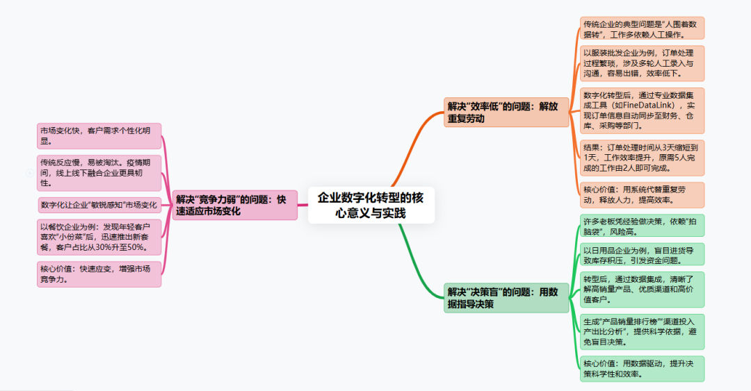 数字化转型过程中,该企业用FineDataLink这样的专业数据集成工具连接了销售的接单系统和财务、仓库系统,销售录入订单后,数据自动同步到各个部门,财务能直接看到待收款订单,仓库能看到待发货信息,采购能根据订单量自动计算补货需求。原来需要5个人做的工作,现在2个人就能搞定,订单处理周期从3天缩短到1天。这就是数字化的价值——用系统代替重复劳动,提高工作效率,把人从高度重复机械化的工作中解放出来。这款好用工具的体验地址我放在这里了,需要自取:https://s.fanruan.com/0dyga(复制到浏览器打开)