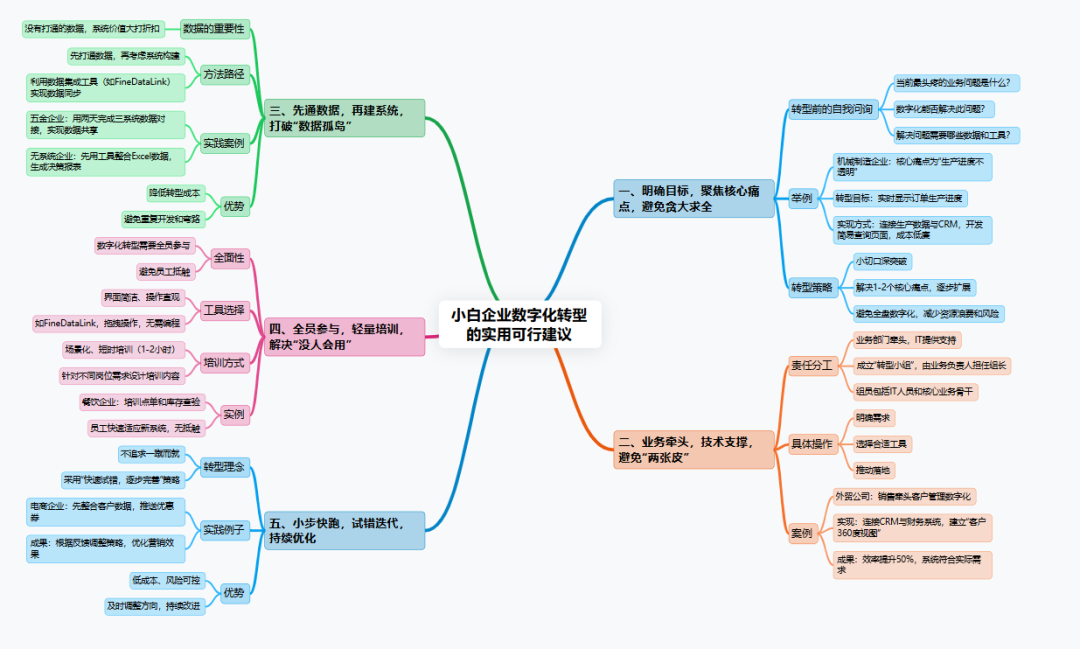 结合我参与的成功项目经验,针对小白企业,我总结了5点转型建议,每一条都经过实操验证,不用复杂的技术和大量的资金,就能快速启动转型。