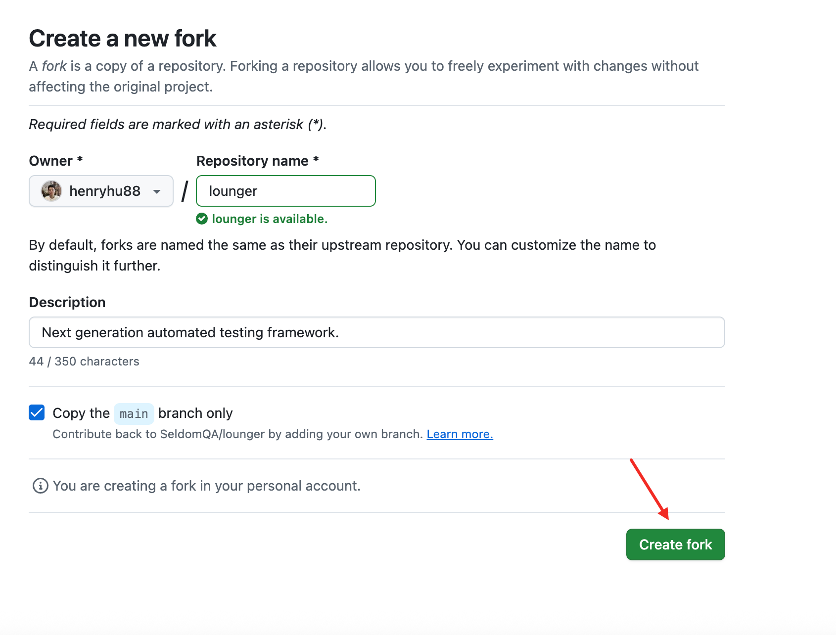 - 选择fork 的账号和项目名称。