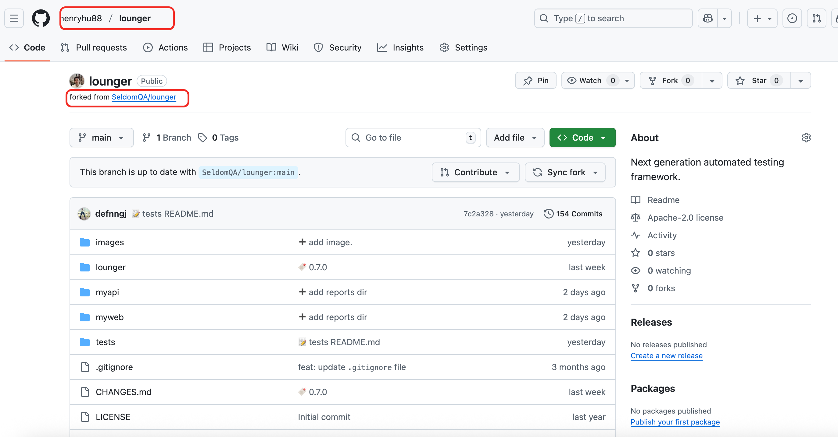 此时,我们又需要继续为这个开源项目继续贡献代码, 只需要在我们fork 的分支项目(henryhu88/lounger)中点击【Sync fork】按钮即可同步源项目最新的代码过来。