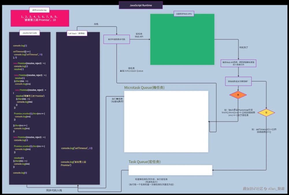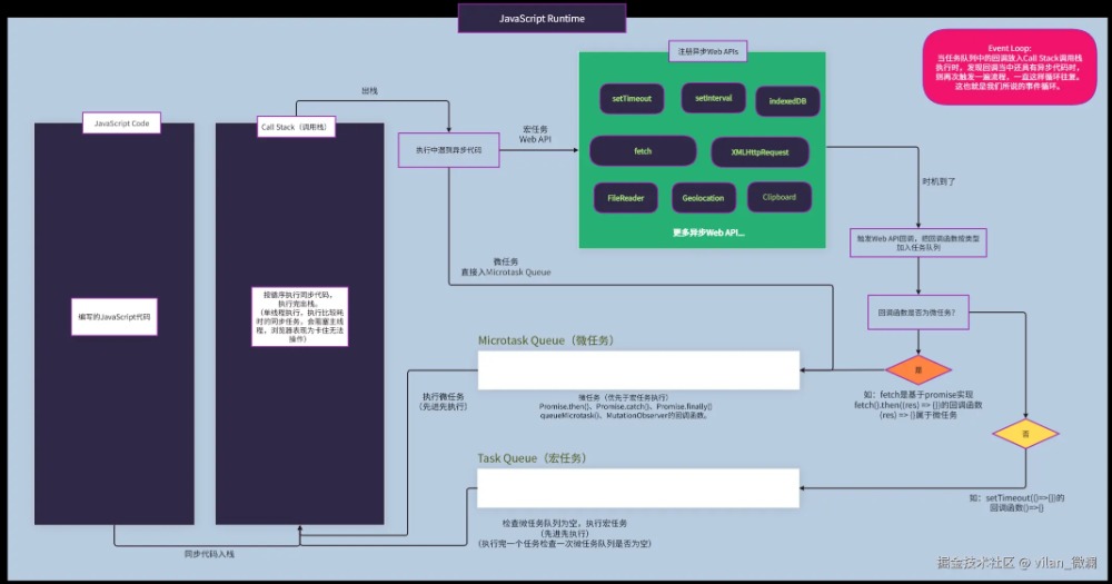 这可能只是简单的JavaScript代码执行事件循环流程,目的也是让大家更直观理解其中原理。实际执行过程可能还会读取堆内存获取引用类型数据、操作dom的方法,可能还会触发页面的重排、重绘等过程、异步文件读取和写入操作、fetch发起网络请求,与服务器建立连接获取网络数据等情况。