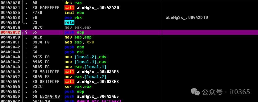 00442A93  |> /8B4D FC       /mov ecx,[local.1]00442A96  |. |0FB64C01 FF   |movzx ecx,byte ptr ds:[ecx+eax-0x1]00442A9B  |. |8B75 FC       |mov esi,[local.1]00442A9E  |. |0FB63406      |movzx esi,byte ptr ds:[esi+eax]00442AA2  |. |0FAFCE        |imul ecx,esi00442AA5  |. |0FAFC8        |imul ecx,eax00442AA8  |. |03D9          |add ebx,ecx00442AAA  |. |40            |inc eax00442AAB  |. |4A            |dec edx00442AAC  |.^\75 E5         \jnz short aLoNg3x_.00442A9300442AAE  |>  8B45 F8       mov eax,[local.2]00442AB1  |.  E8 BA4BFCFF   call aLoNg3x_.0040767000442AB6  |.  2BD8          sub ebx,eax00442AB8  |.  81FB 9A020000 cmp ebx,0x29A00442ABE  |.  75 04         jnz short aLoNg3x_.00442AC400442AC0  |.  B3 01         mov bl,0x1