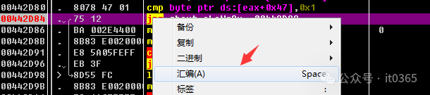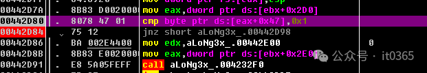 00442D80  |.  8078 47 01    cmp byte ptr ds:[eax+0x47],0x100442D84  |.  75 12         jnz short aLoNg3x_.00442D9800442D86  |.  BA 002E4400   mov edx,aLoNg3x_.00442E00                ;  000442D8B  |.  8B83 E0020000 mov eax,dword ptr ds:[ebx+0x2E0]00442D91  |.  E8 5A05FEFF   call aLoNg3x_.004232F000442D96  |.  EB 3F         jmp short aLoNg3x_.00442DD7