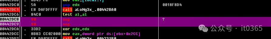 00442DC1  |.  E8 DAFDFFFF   call aLoNg3x_.00442BA000442DC6  |.  84C0          test al,al00442DC8  |.  74 0D         je short aLoNg3x_.00442DD7               ;  ?