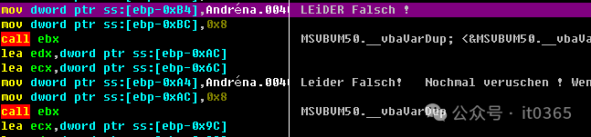 004021D6   > \8D4D CC       lea ecx,dword ptr ss:[ebp-0x34]004021D9   .  8D95 54FFFFFF lea edx,dword ptr ss:[ebp-0xAC]004021DF   .  51            push ecx                                 ; /var18 = 0018F404004021E0   .  8D45 94       lea eax,dword ptr ss:[ebp-0x6C]          ; |004021E3   .  52            push edx                                 ; |var28 = 0018F38C004021E4   .  50            push eax                                 ; |SaveTo8 = 0018F3CC004021E5   .  C785 5CFFFFFF>mov dword ptr ss:[ebp-0xA4],0x499602D2   ; |004021EF   .  C785 54FFFFFF>mov dword ptr ss:[ebp-0xAC],0x3          ; |004021F9   .  FF15 5C414000 call dword ptr ds:[<&MSVBVM50.__vbaVarMu>; \__vbaVarMul
