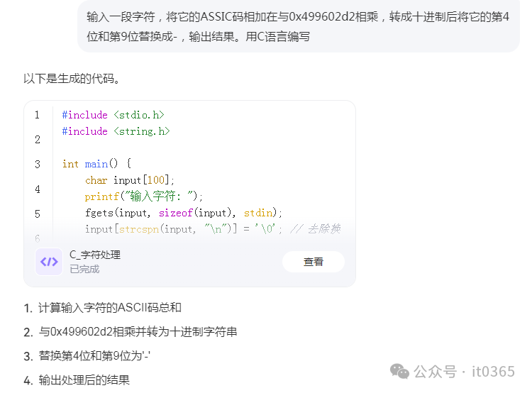int main() {    char input[100];    printf("输入字符: ");    fgets(input, sizeof(input), stdin);    input[strcspn(input, "\n")] = '\0'// 去除换行符