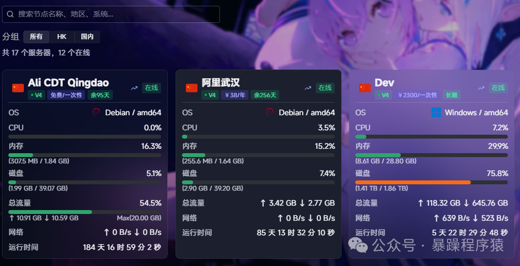 简介Komari是一个轻量级、自托管的服务器监控工具,旨在为用户提供简单、高效的服务器性能监控解决方案。主要功能轻量高效:Komari的资源消耗极低,其代理程序(Agent)在被监控服务器上的内存占用稳定在10MB以内,CPU使用率几乎可以忽略不计(日常维持在0.1%-0.5%)。这使得它能够适应各种规模的服务器环境,...