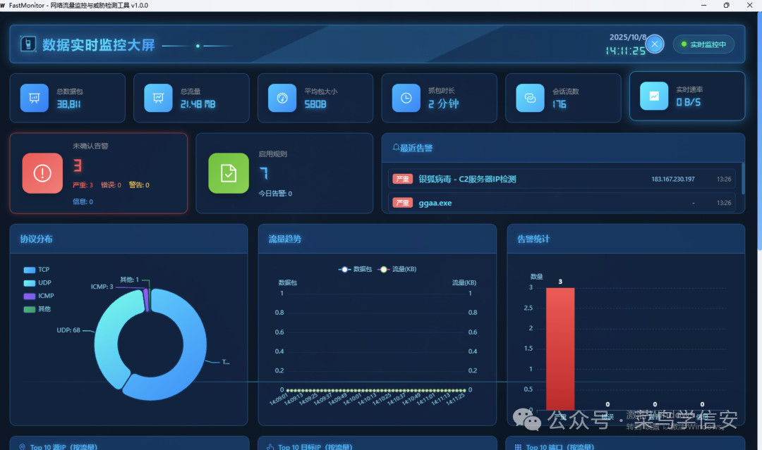 工具介绍FastMonitor是一款基于Wails框架开发开源的跨平台网络流量监控与威胁检测工具,集成了数据包分析、进程关联、会话流统计、威胁情报检测、地理位置可视化等功能于一体。核心特性🚀高性能抓包引擎:基于gopacket/pcap实现,支持数据包实时处理,并对五元组会话/DNS/ICMP/HTTP进行分类展示�...