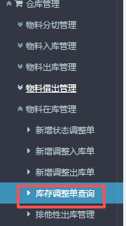 点晴ERP-库存调整单查询-操作流程 进入ERP系统之后,在左侧的功能菜单里找到“仓库管理”,点开“物料在库管理”,点击“库存调整单查询”。 2.进入界面后,按图操作进行查找:先点击查询,然后可以确认当前物料的调整前后状态。根据情况选择批量操作(打印、作废和审核)