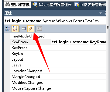 3、增加textbox控件的KeyDown事件,防止Ctrl+V方式复制中文进来,先点击属性窗口中的闪电图标,显示出控件可用事件,双击“KeyDown”,就会自动给当前控件增加KeyDown事件:
