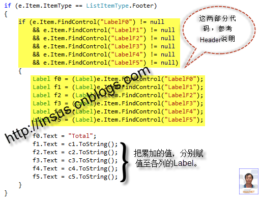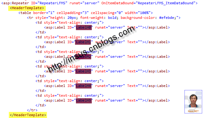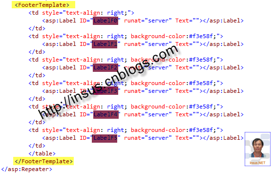 下面将是Repeater控件的OnItemDataBound事件,Insus.NET也分别对header,Item以及Foot进行图列说明代码: