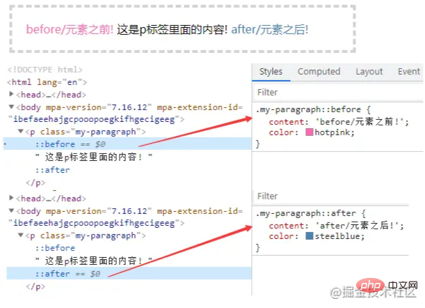 ::before和::after可以添加到选择器以创建伪元素的关键字。伪元素被插入到与选择器匹配的元素内容之前或之后。