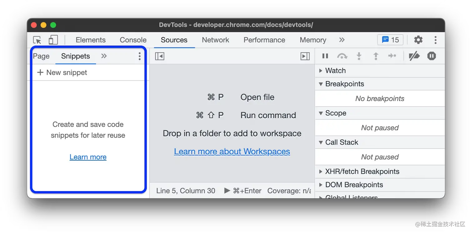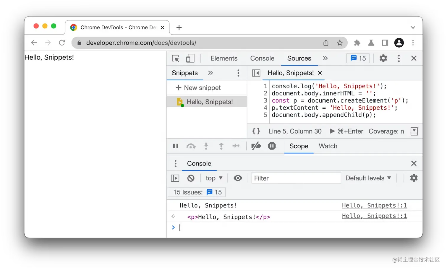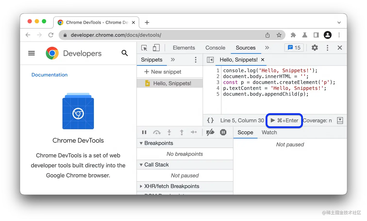 举个例子,如下截图所示,页面左侧展示了 DevTools 站点文档主页,页面的右侧展示了 Sources > Snippets 板块的片段源代码。