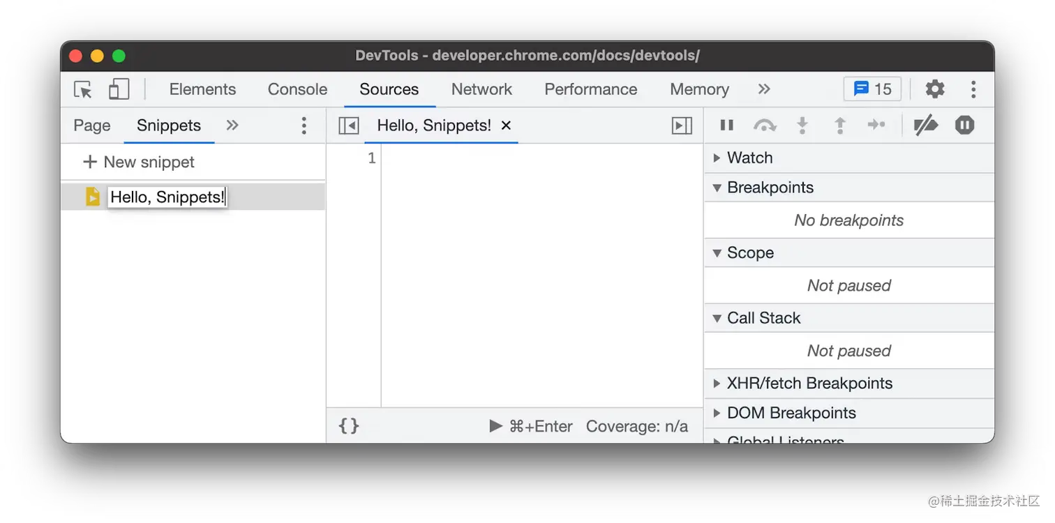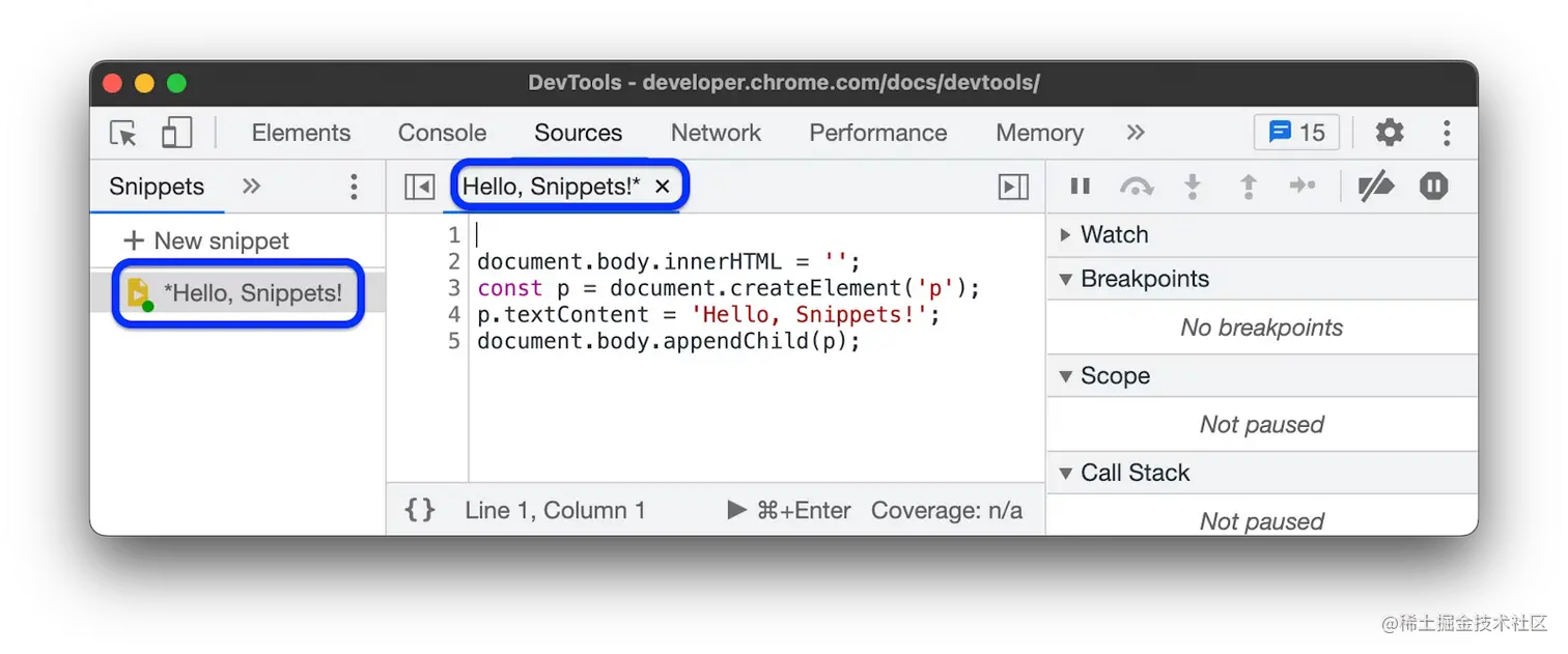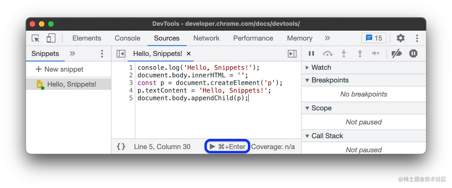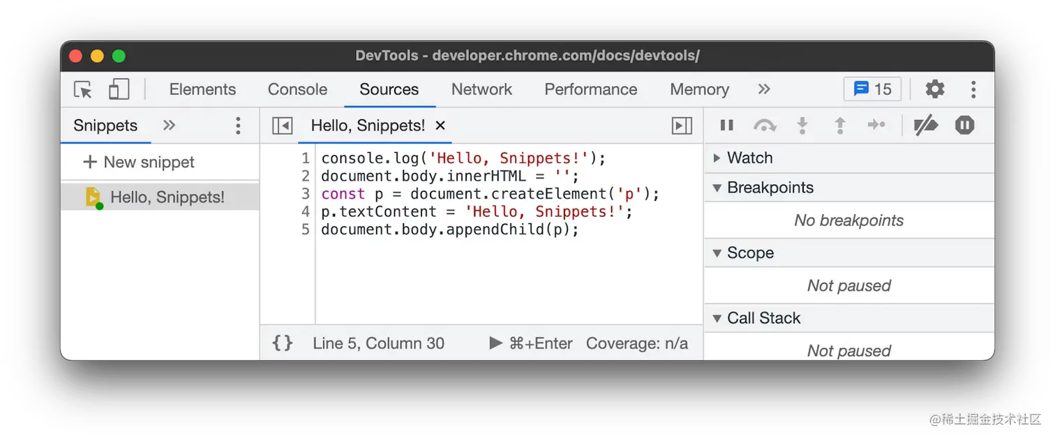 举个例子,如下截图所示,页面左侧展示了 DevTools 站点文档主页,页面的右侧展示了 Sources > Snippets 板块的片段源代码。