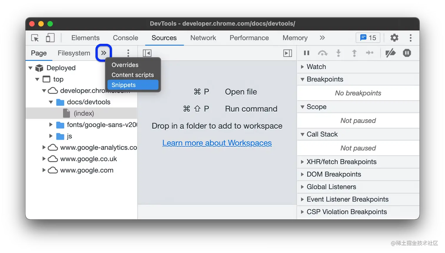 如果你发现自己反复使用 Console 来运行同一份代码,那么你应该考虑将代码保存成片段。Snippets 是你在 Source 面板中创建的脚本。这些脚本可以获取到页面的 Javascript 上下文,你可以在任意页面运行它们。代码片段就是书签bookmarklets的替代品。