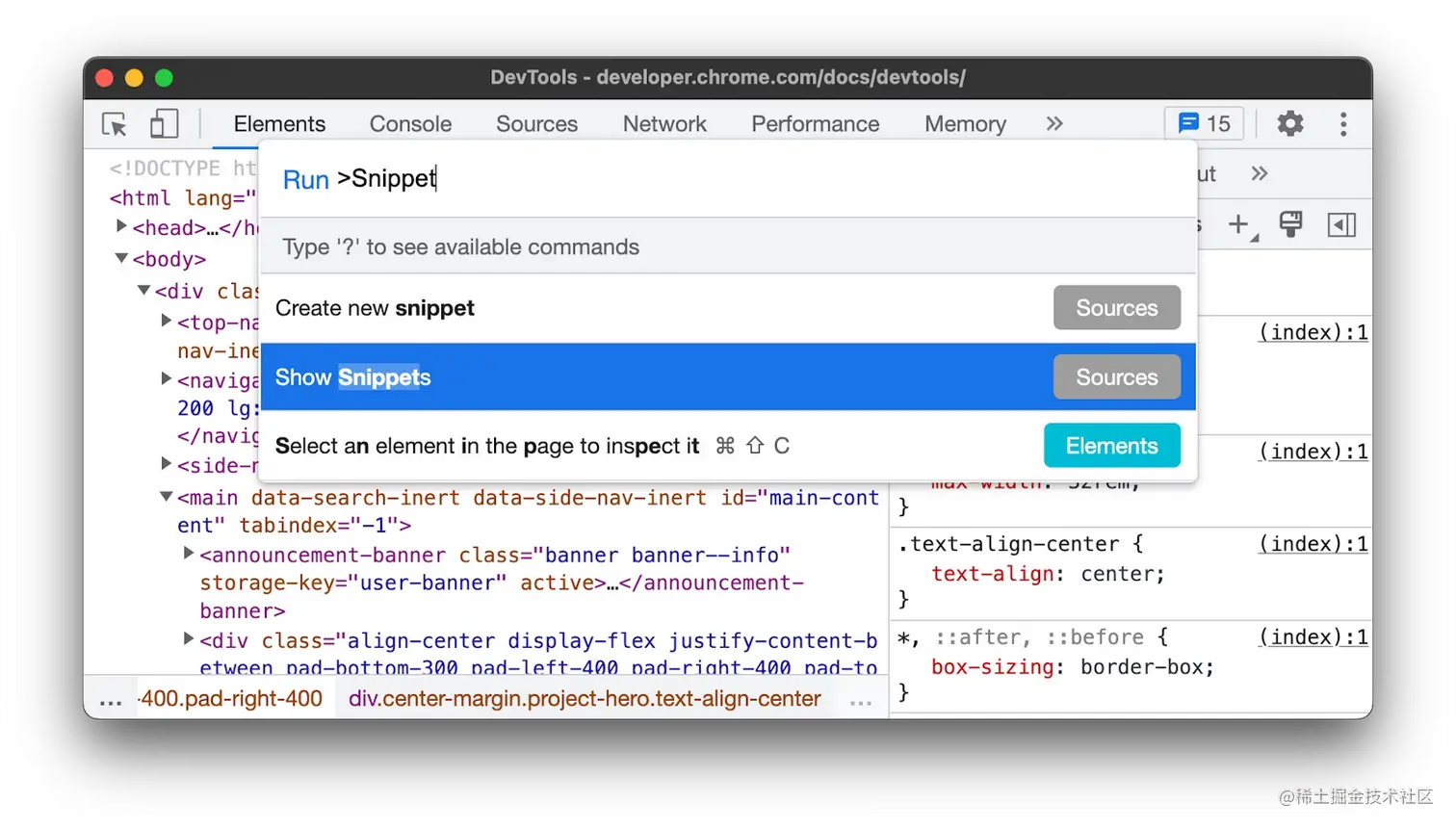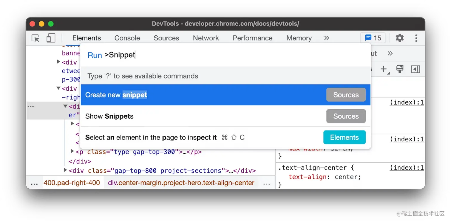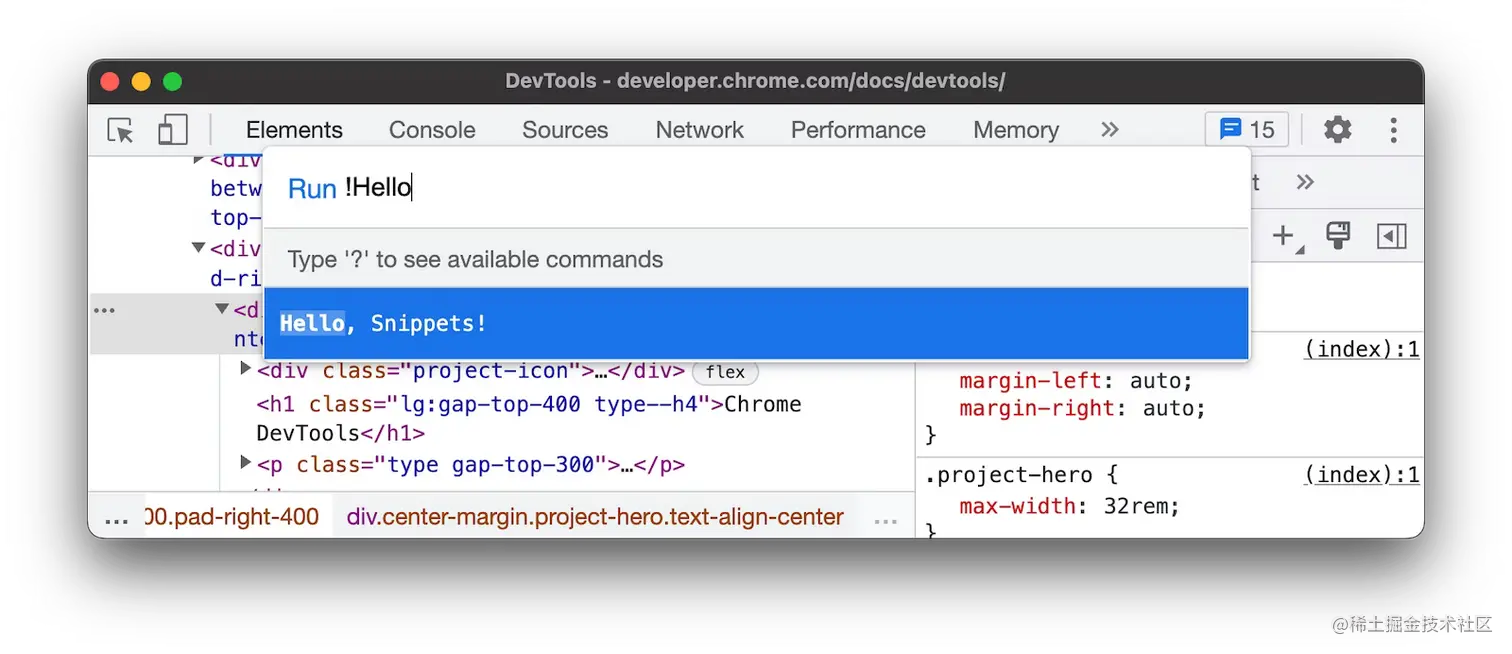 你可以通过在 Snippets 面板中创建片段。或者,通过 在 DevTools 任意位置打开**命令菜单(Command Menu)运行相应的命令行。