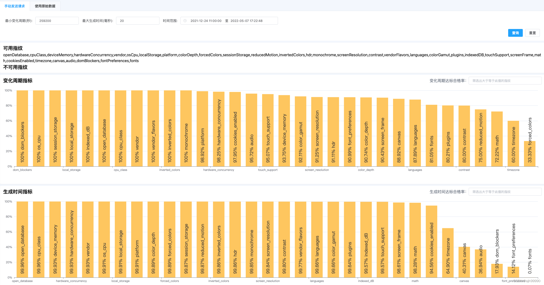 }afcc(指纹平均变化周期)://例如计算browserMark为cde2267cc4c61e7bd9ebb893e2da3193的设备的fonts指纹的平均变化周期function calculateAfcc() {