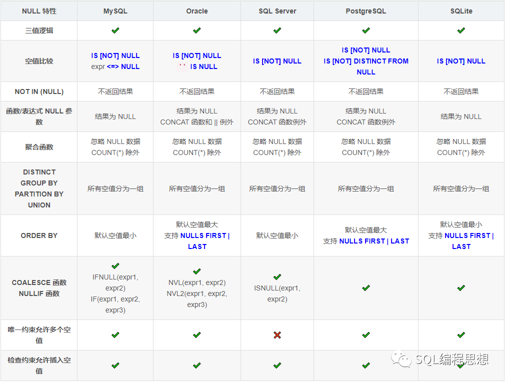 今天我们就来说说 SQL 中的空值陷阱和避坑方法,涉及的数据库包括 MySQL、Oracle、SQL Server、PostgreSQL 以及 SQLite。还是老规矩,结论先行: