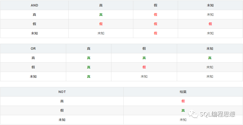 在大多数编程语言中,逻辑运算的结果只有两种情况,不是真(True)就是假(False)。但是对于 SQL 而言,逻辑运算还可能是未知(Unknown):
