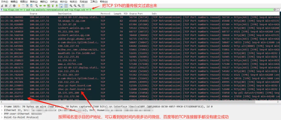 手段1:出口路由web上打开实时流量统计再看一下会话数:如果打开网页、应用等频繁操作上网会话数不再增长,基本实锤线路限制会话数。但此功能需要路由器支持。手段2:镜像抓取出口路由器WAN口报文做分析。数据包NAT出去后大量SYN没有得到响应而重传,基本实锤是会话数限制导致:
