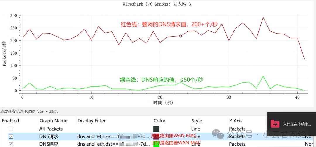 手段1:高峰期使用Windows PC上使用nslookup命令尝试使用不同的DNS Server去解析域名。如果多次尝试都没得到响应说明或者仅成功少数,大概率实锤线路存在DNS阈值限制备注:DNS阈值限制即pps限制,比如限制阈值=20pps,表示每秒最大可响应20个DNS请求,超出部分全部丢弃。手段2:抓取异常高峰期路由器WAN口流量分析DNS报文的请求和响应曲线。这种方法相较于手段1更准确。当发现DNS请求明显高于响应的,基本实锤线路存在DNS限制阈值,如下: