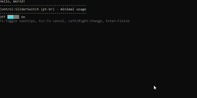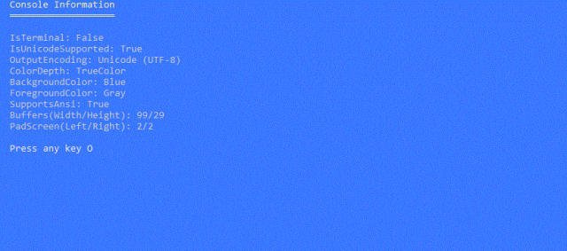 PromptPlus.Setup((cfg) =>{ cfg.PadLeft = 2; cfg.PadRight = 2; cfg.Culture = new CultureInfo("en-us"); cfg.BackgroundColor = ConsoleColor.Blue;});PromptPlus.Join() .SingleDash($"[yellow]Console Information[/]", DashOptions.DoubleBorder, 1 ); .WriteLine($"IsTerminal: {PromptPlus.IsTerminal}"); .WriteLine($"IsUnicodeSupported: {PromptPlus.IsUnicodeSupported}"); .WriteLine($"OutputEncoding: {PromptPlus.OutputEncoding.EncodingName}"); .WriteLine($"ColorDepth: {PromptPlus.ColorDepth}"); .WriteLine($"BackgroundColor: {PromptPlus.BackgroundColor}"); .WriteLine($"ForegroundColor: {PromptPlus.ForegroundColor}"); .WriteLine($"SupportsAnsi: {PromptPlus.SupportsAnsi}"); .WriteLine($"Buffers(Width/Height): {PromptPlus.BufferWidth}/{PromptPlus.BufferHeight}"); .WriteLine($"PadScreen(Left/Right): {PromptPlus.PadLeft}/{PromptPlus.PadRight}\n");PromptPlus .KeyPress() .Config(cfg => { cfg.HideAfterFinish(true) .ShowTooltip(false) .ApplyStyle(StyleControls.Tooltips,Style.Plain.Foreground(Color.Grey100)); }) .Spinner(SpinnersType.Balloon) .Run();