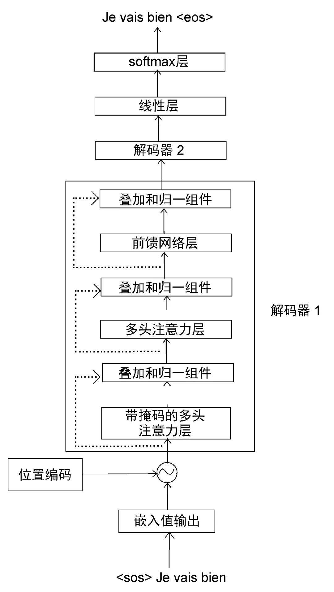 • 首先,我们将解码器的输入转换为嵌入矩阵,然后将位置编码加入其中,并将其作为输入送入底层的解码器(解码器 1)。