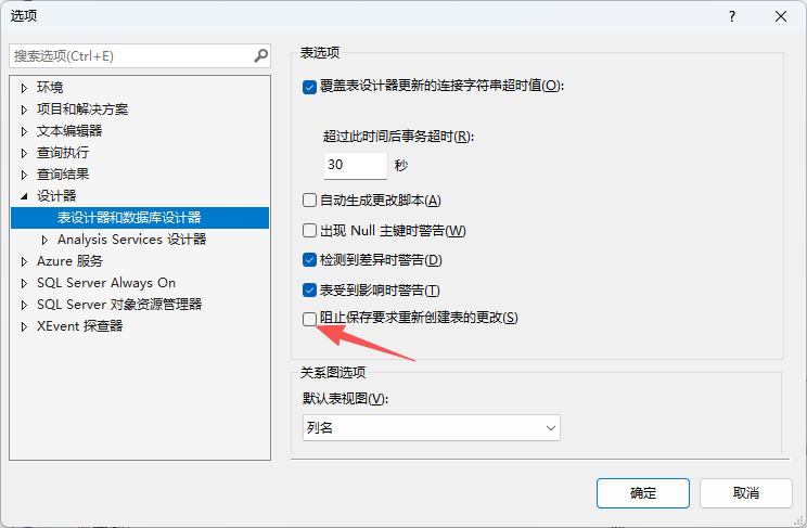 ​然后将红框处的「阻止保存要求重新创建表的更改」内容取消打 √,如下图所示;