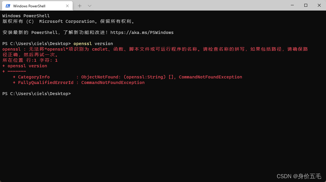 openssl : 无法将“openssl”项识别为 cmdlet、函数、脚本文件或可运行程序的名称。请检查名称的拼写,如果包括路径,请确保路径正确,然后再试一次。