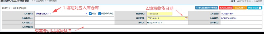 2.进入“新增BOE组件来料单”界面后,先填写好基本的信息:入库仓库、收货日期。