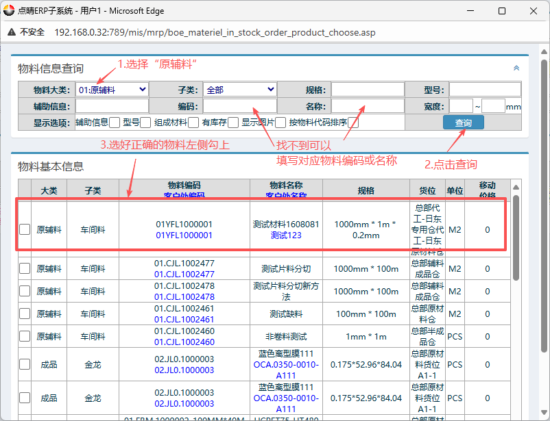 在下方显示查询出来的物料信息里选择好正确的物料,点击对应物料信息。