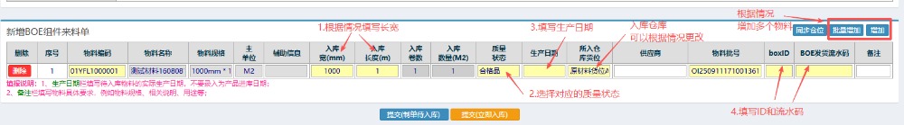选择好物料之后,按图操作:填写物料的长宽,选择对应的质量状态(成品、制损品、材损品等)以及入库仓库