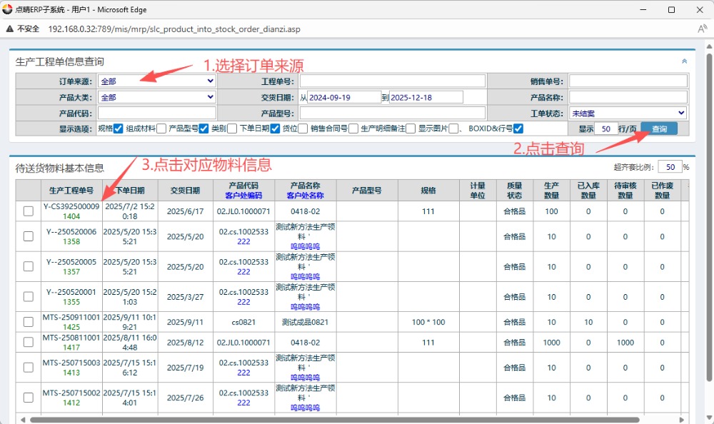 在弹窗的物料信息窗口内,选择订单来源,点击查询。然后点击对应物料信息