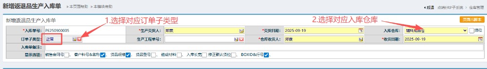 2.进入界面后,按图操作:选择对应的订单子类型(正常返退品、制损品),然后选择对应入库仓库