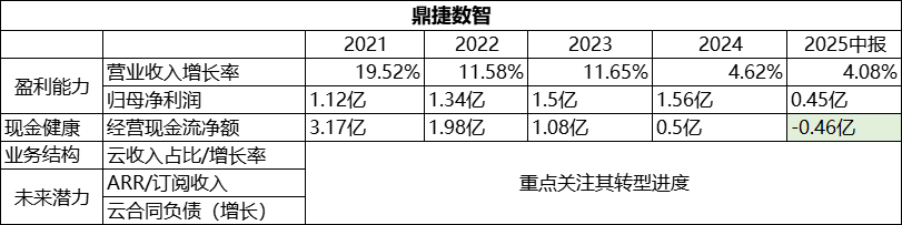 • 对于相对传统的鼎捷软件:由于其转型节奏更稳健,可以更均衡地看待传统软件收入和云服务收入(转型进度)的增长,同时关注其稳定的盈利能力(重点为归母净利润)、经营现金流净额(重点)是否为正;