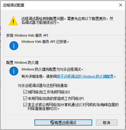 https://learn.microsoft.com/zh-cn/troubleshoot/developer/visualstudio/debuggers/troubleshooting-remote-debugging?toc=%2Fvisualstudio%2Fdebugger%2Ftoc.json&view=vs-2022