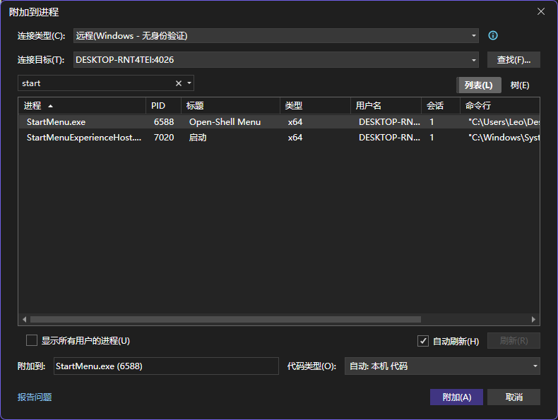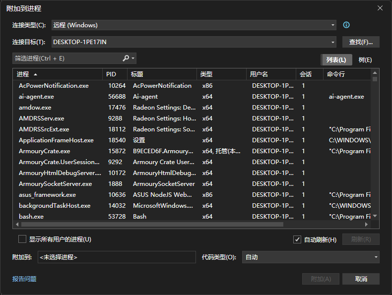 连接成功后,再选择对应进程,附加到该进程上:
