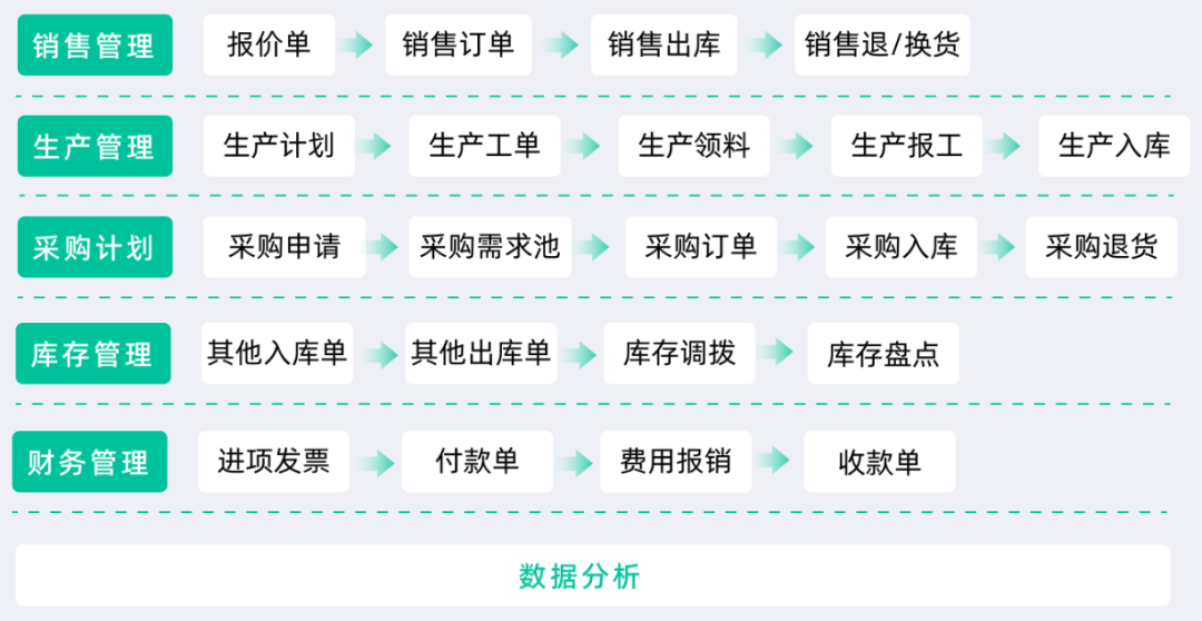 • 后来才慢慢扩展到采购、销售、生产、库存。