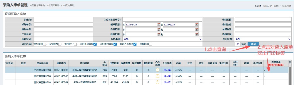 10.回到“采购入库计划及打印标签”页面,再次点击查询,可以看到刚才扫码的物料已经成功入库了。