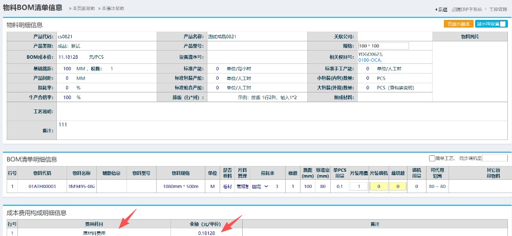 答:其中单位费用数值来源于BOM资料对应的材料费用合计,需维护好bom对应的材料以及单价,如下图所示
