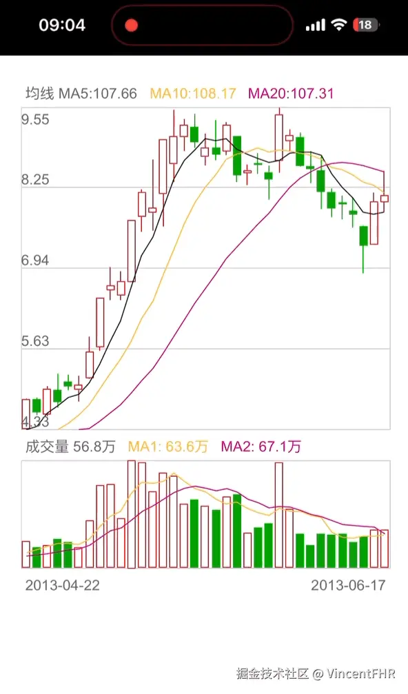 从上面的图可以看出, 需要画 5日均线、10日均线、20日均线, 成交量快线(10日)、成交量慢线(20日) 但是, 接口没有给出当日的均线值, 需要自己计算。