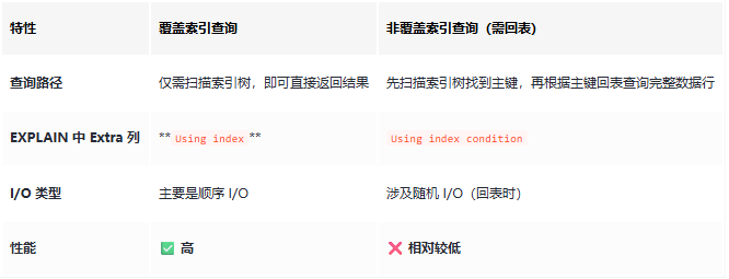 回表的代价:回表意味着更多的磁盘 I/O(特别是当主键无序时,会导致性能更低的随机 I/O)和更高的 CPU 开销。覆盖索引通过将查询所需的字段全部“包含”在索引的叶子节点中,使得引擎无需回表,一步到位获取数据,从而避免了这些开销。